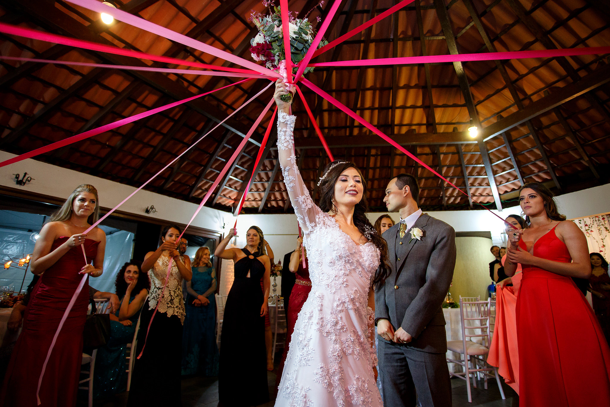 Nosso último momento protocolar é o buquê. Jogar, brincar, prender, fazer a opção com fitas, de qualquer forma vamos precisar de uma música e que seja bem animada.