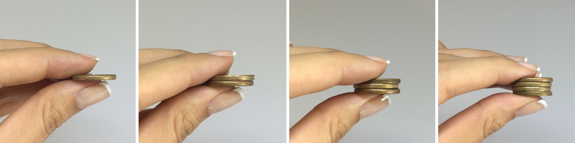 Para medir o tamanho da aliança em casa. Uma moeda de 10 centavos equivale a 2mm. Na figura respectivamente 2mm – 4mm – 6mm – 8mm