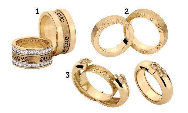 Cravejadas: Se as alianças vão ter pedras ou não é uma escolha muito pessoal. Vários casais optam por somente a aliança da mulher ter diamantes, existem casais em que ambas as alianças tem pontos de brilhante e outros que preferem manter o mais simples ou ainda colocar entalhes e neste caso os brilhantes não cabem ali.