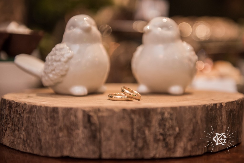 Alianças retas, com espessura de 1mm. O modelo dela cravejado com 3 diamantes na vertical. Foto: Kelly Gequelim